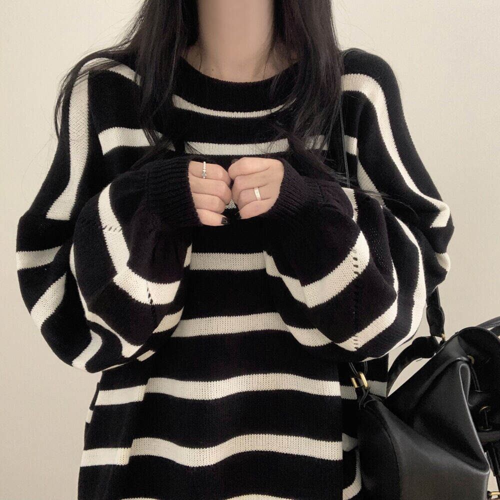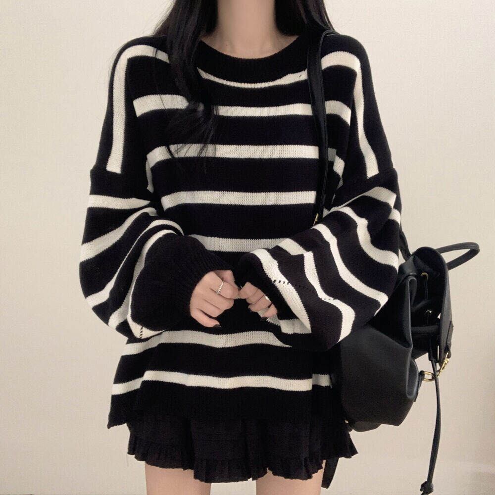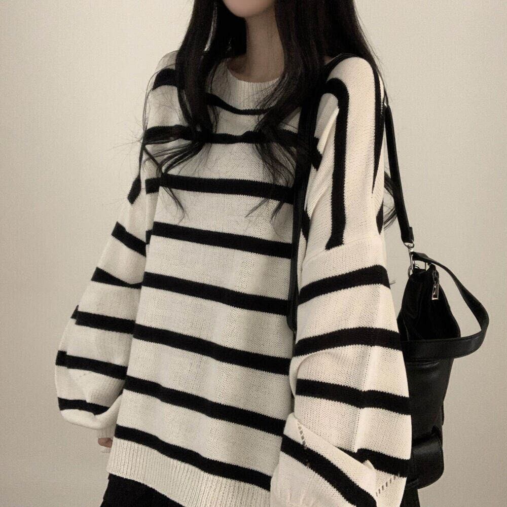 モノトーンでシックに決まる、白×黒ボーダーの薄手ニット。